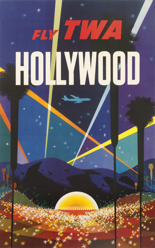 The '50s Style was applied to consumer services as well as products. Airline campaigns sought to attract travelers to destinations like Disneyland, New York, Las Vegas, and Paris. The work of David Klein for TWA and Stan Galli for United epitomize these campaigns. Klein's magical nighttime view of the Hollywood Bowl was particularly successful. A colorful and brilliant scene shows tall palms and dynamic spot lights rising into the sky toward twinkling stars and a TWA jet. The airline printed the poster twice, first in the late 1950s with a prop plane, and again in the early 1960's with a jet, as seen in the exhibition.
